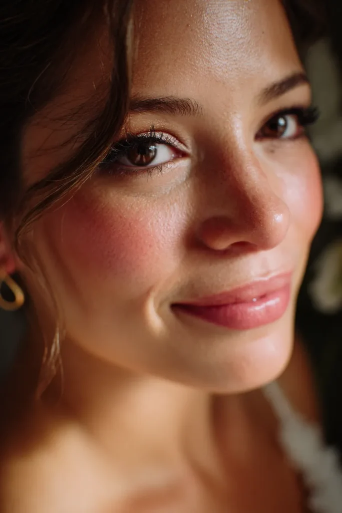 I absolutely love how beautifully this makeup captures a feeling of pure romance and a natural, joyful glow. That bright pink blush is strategically placed to lift and illuminate her face, making it feel so youthful and vibrant—the perfect aesthetic for a spring wedding. It’s a very flattering technique because it truly enhances her natural bone structure while keeping the overall look soft and approachable. Seriously, the combination of those rosy cheeks and the glossy nude lip is a recipe for wedding day perfection and a truly unforgettable look.