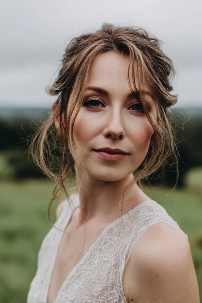 This bride models a beautiful, slightly smokey makeup look that pairs perfectly with her romantic hairstyle and the natural outdoor setting. Her complexion is matte yet radiant, defined by soft rosy blush and subtle contouring under the cheekbones. Her eyes are the focus, featuring a warm, earthy eyeshadow blend that creates a soft, diffused smokey effect, enhanced by dark eyeliner and full lashes. The lips are kept muted with a peachy-nude matte color. Her hair is styled in a loose, textured updo with gorgeous, wispy pieces falling around her face, giving a very relaxed and windswept impression. The dress features delicate white lace and a deep V-neckline.