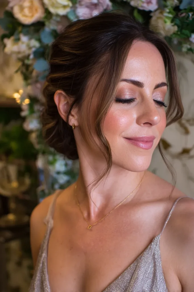 This beautiful bridal look centers on a perfect luminous finish for both the skin and the eyes. Her complexion has an enviable, high-wattage glow thanks to a carefully placed warm blush and a shimmering highlighter across the cheekbones. Her eye makeup features a gorgeous shimmering pink and champagne eyeshadow that catches the light beautifully when her eyes are closed, complemented by a soft dark eyeliner and long, defined lashes. A sheer, glossy pink lip completes the look. Her hair is elegantly swept up with soft, face-framing pieces and she wears a delicate gold necklace with a tiny pendant over a shimmery champagne-toned dress.