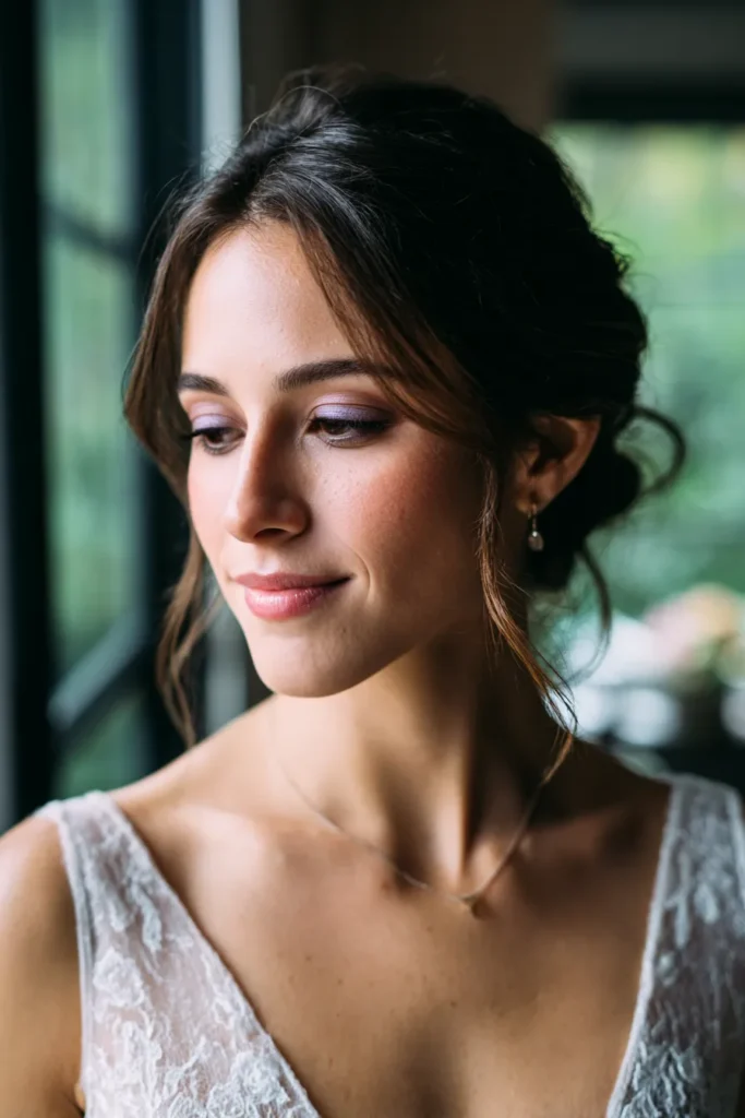 This beautiful portrait features a bride wearing a delicate lace V-neck dress, minimally accessorized with a thin silver necklace and simple drop earrings. Her hair is styled in a relaxed, low updo with soft, romantic tendrils left out around her face and neck. The standout feature is a stunning wash of soft, shimmery lavender-purple eyeshadow on her eyelids, which is blended beautifully with subtle, warmer neutral tones in the crease. The rest of her makeup includes defined brows, a gorgeous natural glow, and a soft pink nude lip color.