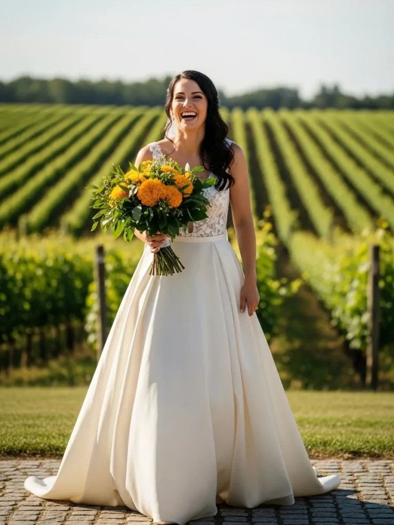 The bride wears a flowing ivory gown with a simple fitted bodice and a softly draped skirt that moves beautifully in the light. Her bouquet mixes sunny yellows with warm greenery which pops against the vineyard rows behind her. The setting feels open and bright with neat green lines stretching into the distance under clear daylight.