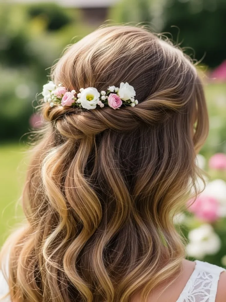 The bride’s hair is styled half up with soft waves flowing down her back. A delicate floral crown made of tiny pink and white flowers rests gently in her hair. The look feels natural and romantic.