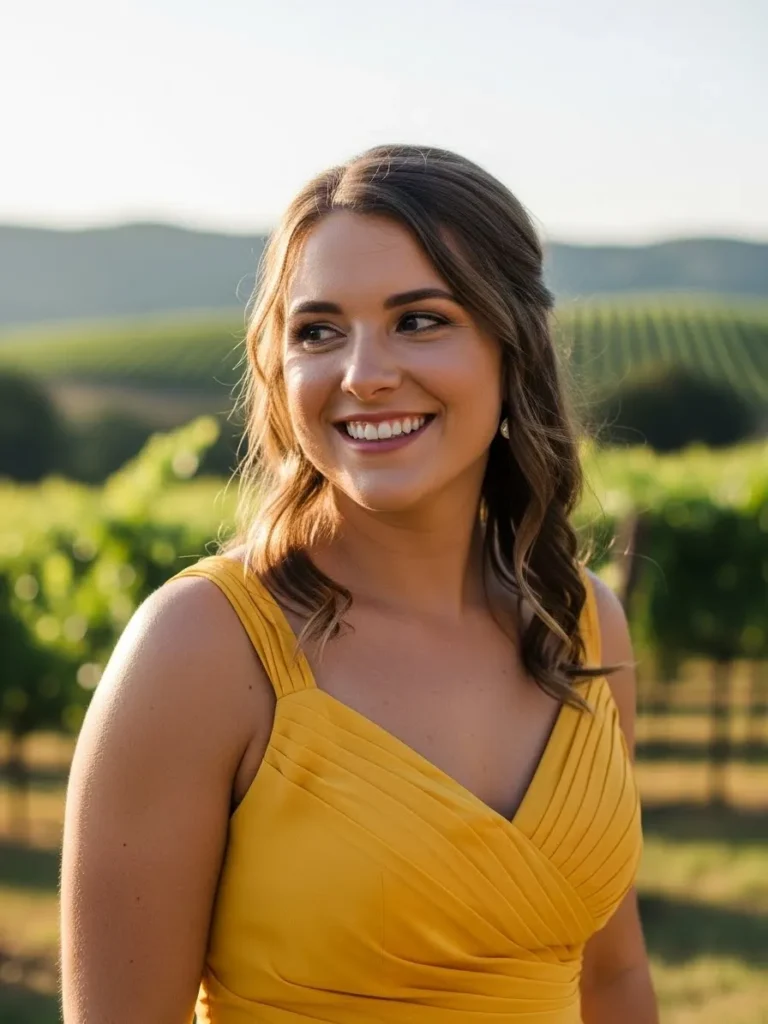 She wears a soft golden yellow dress with delicate pleating and a flattering fitted bodice. The color glows in natural light and feels perfectly suited for a vineyard setting. Her look feels relaxed polished and very summery.