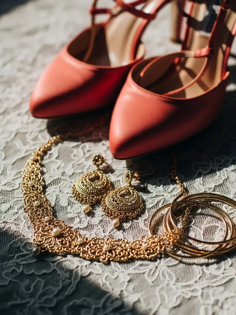 Deep red bridal shoes sit beside gold jewelry and delicate accessories arranged on textured fabric. The rich tones feel warm and elegant while the metallic details catch the light beautifully. Everything feels thoughtfully styled but still relaxed.