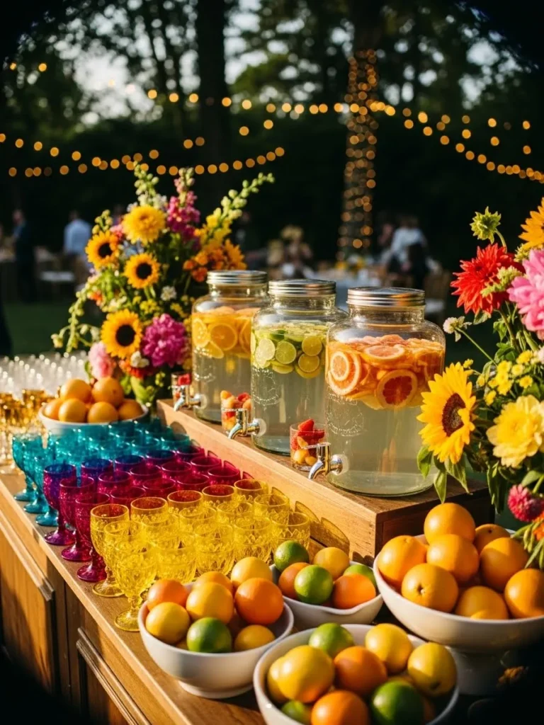 A cheerful drink station features glass jars filled with citrus infused beverages surrounded by fresh fruit and vibrant florals. Oranges lemons and limes add bold pops of color across the table. String lights overhead give the setup a cozy evening glow.
