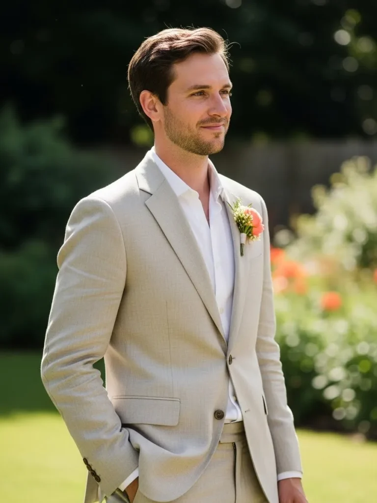 The groom wears a light beige suit paired with a crisp white shirt and a subtle boutonniere. The soft neutral tone looks fresh against the greenery around him. The overall look feels clean modern and seasonally perfect.