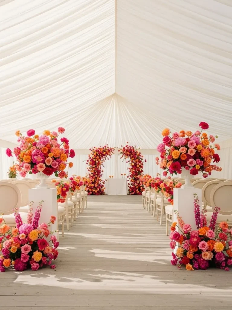 A white draped tent frames the ceremony space with a clean and airy backdrop. Bold floral arrangements in pink coral orange and yellow line the aisle and surround the altar. The structured tent paired with playful florals creates a beautiful contrast.