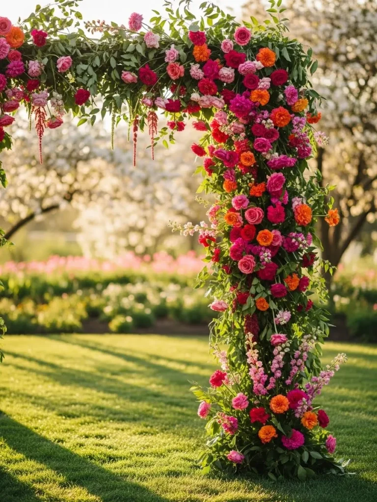 This floral arch is covered in bold summer blooms like pinks oranges and coral tones layered with greenery. The flowers cascade in a loose organic way creating a soft curved shape that stands out against the fresh green lawn. Sunlight filters through the florals which gives the whole setup a glowing feel.