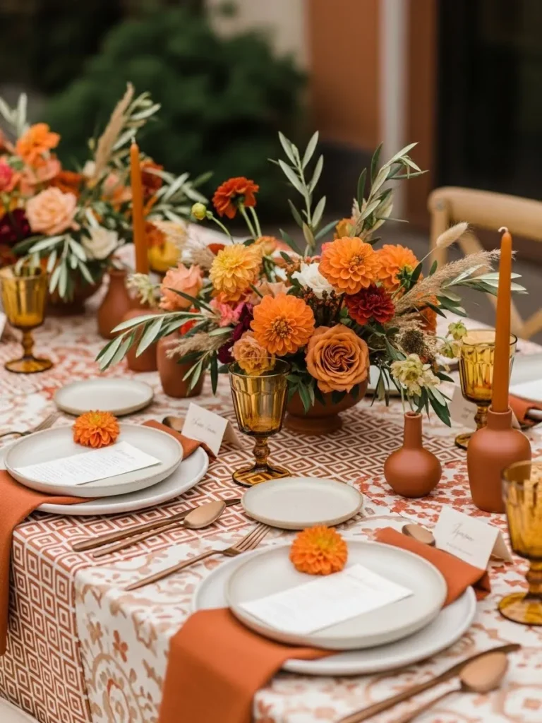 The table is styled with terracotta runners warm orange florals and soft neutral plates. Gold accents and textured fabrics add depth to the setup. Everything feels cozy yet elevated.