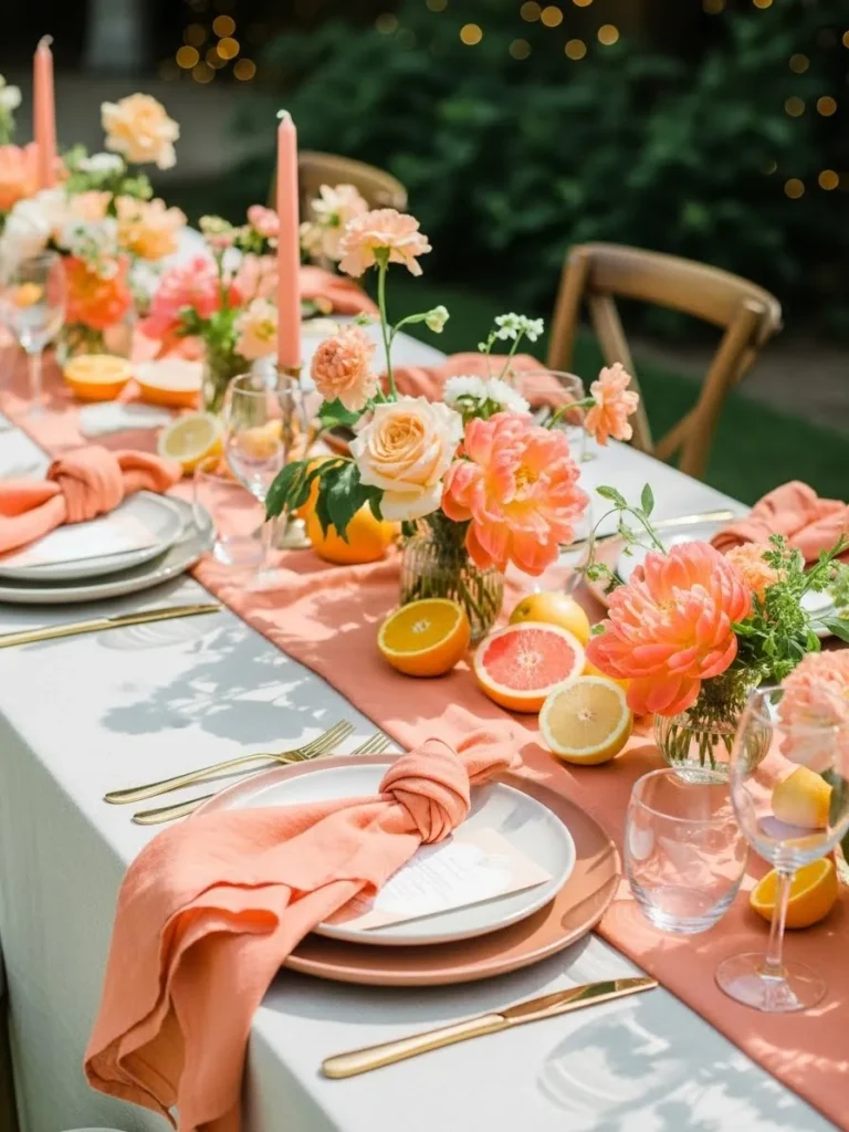 Soft peach linens flow across the table paired with peach florals and sliced citrus accents. Candles and glassware catch the sunlight and add sparkle. The look feels fresh and relaxed.