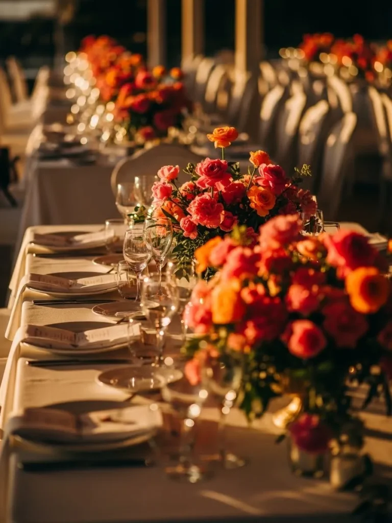 The long reception table is styled with crisp neutral linens and glowing glassware set neatly at each place. Lush floral centerpieces run down the table featuring coral pink and warm orange blooms mixed with fresh greenery. Soft golden light hits the flowers and glass which creates a rich sunlit atmosphere that feels cozy and elegant at the same time.