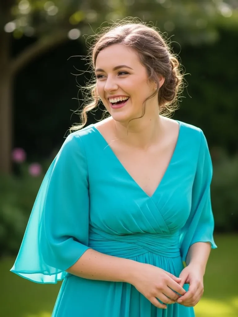 The bridesmaid wears a rich teal dress with a relaxed fit and soft flutter sleeves. The fabric looks light and breathable which works perfectly for an outdoor celebration. Her hair is styled simply which keeps the focus on the color and movement of the dress.