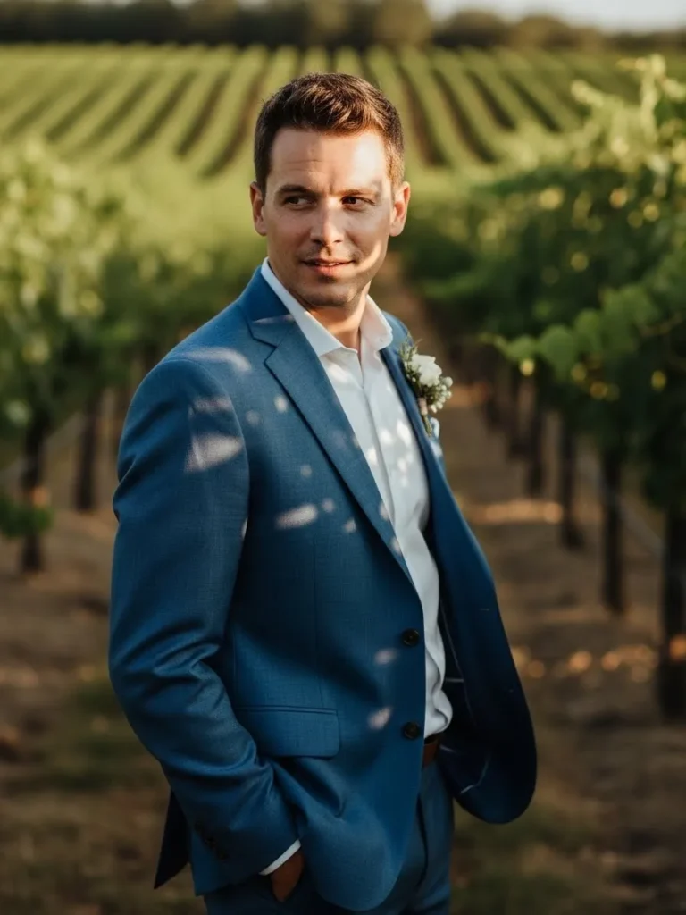 The groom wears a tailored deep blue suit paired with a crisp white shirt. The color contrasts beautifully with the vineyard backdrop and warm sunlight. Everything about the look feels clean polished and timeless.