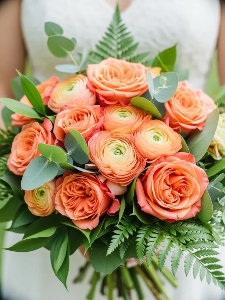 This bouquet features soft peach roses mixed with fresh green leaves and fern details. The flowers are arranged loosely which gives it a natural garden feel. The colors feel warm gentle and very romantic.