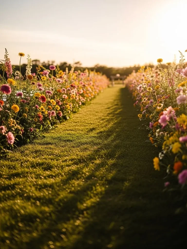 A long grassy aisle is framed by overflowing wildflowers in soft pink yellow and lavender tones. The blooms feel loose and natural as they spill gently toward the pathway. Warm sunlight hits the grass which gives the whole scene a golden glow.