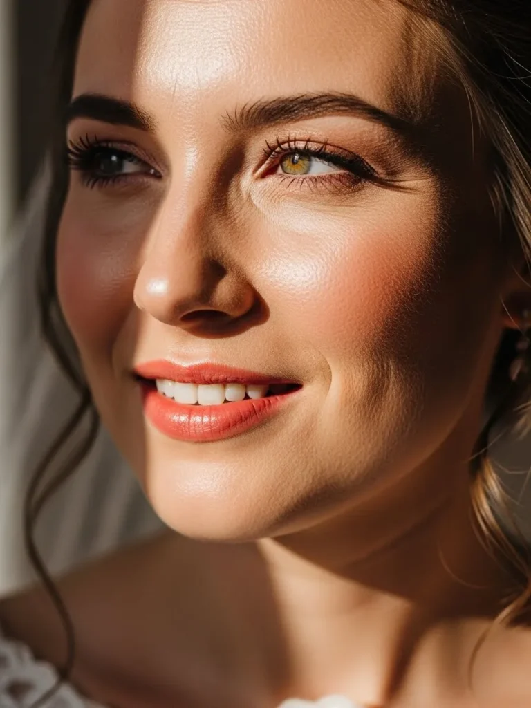 The bride wears fresh peach toned makeup with softly defined eyes and a natural luminous complexion. Her skin looks warm and radiant while the blush and lip color add just enough color. Everything feels light and effortless.