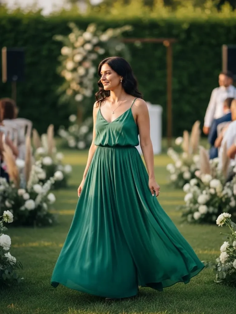 This look feels confident and elegant at the same time. I always think green is such a strong summer wedding color because it feels grounded and fresh. It stands out without overpowering the scene.