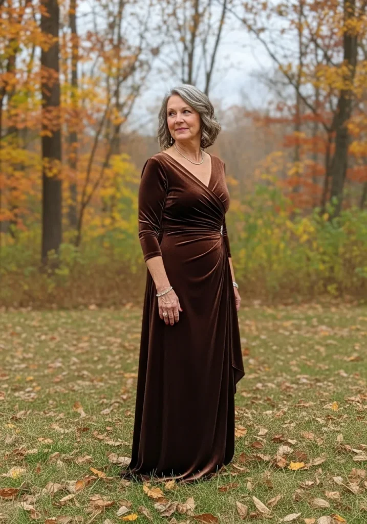 This look features a rich chocolate brown velvet gown with a flattering wrap-style bodice, three quarter sleeves, and a softly flowing skirt that moves beautifully with every step. The fabric catches the autumn light just enough to highlight its depth, while the relaxed silhouette keeps the overall feel polished yet comfortable.