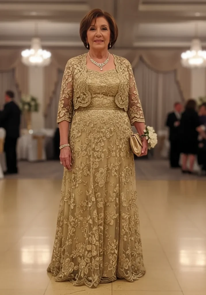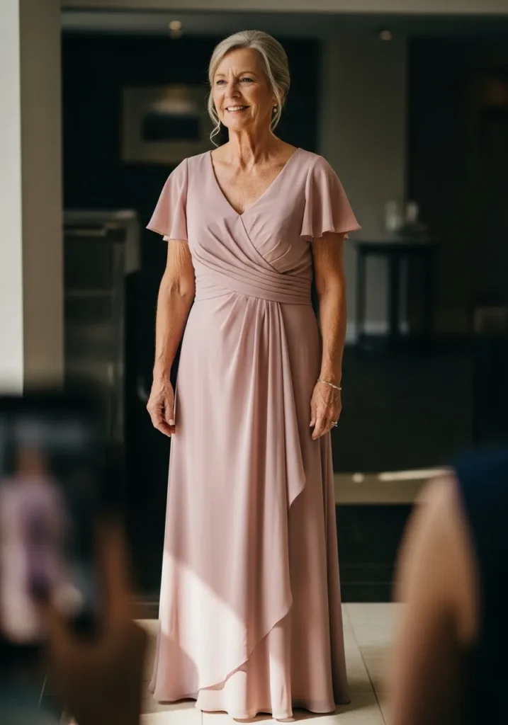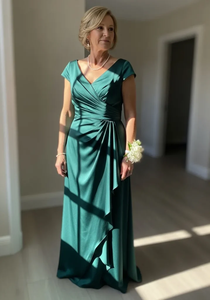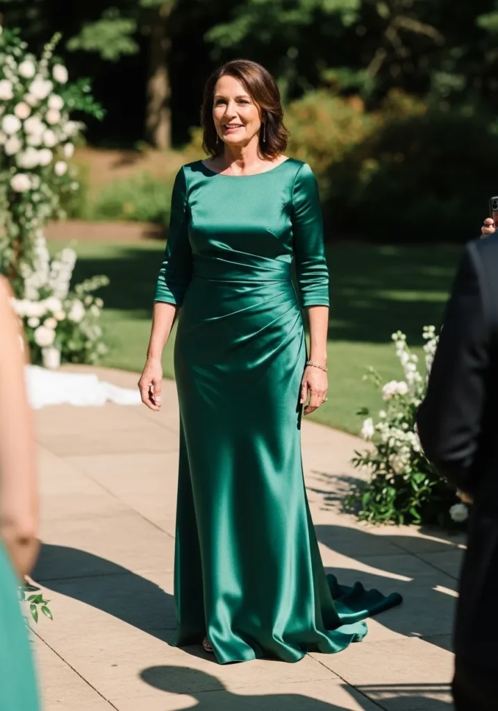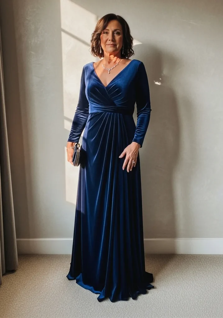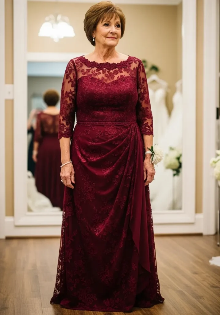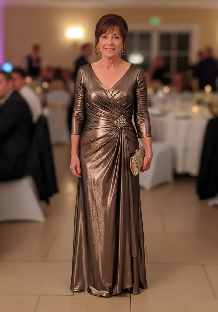 I’m completely smitten with how luxurious this dress looks under warm indoor lighting. It feels regal, polished, and timeless, making it such a stunning option for mothers who want something rich and memorable without feeling overly flashy.
