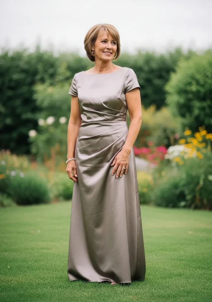 This soft taupe satin gown offers a clean silhouette with short sleeves, a gently cinched waist, and a smooth flowing skirt. The understated design allows the fabric’s natural sheen and elegant drape to take center stage.