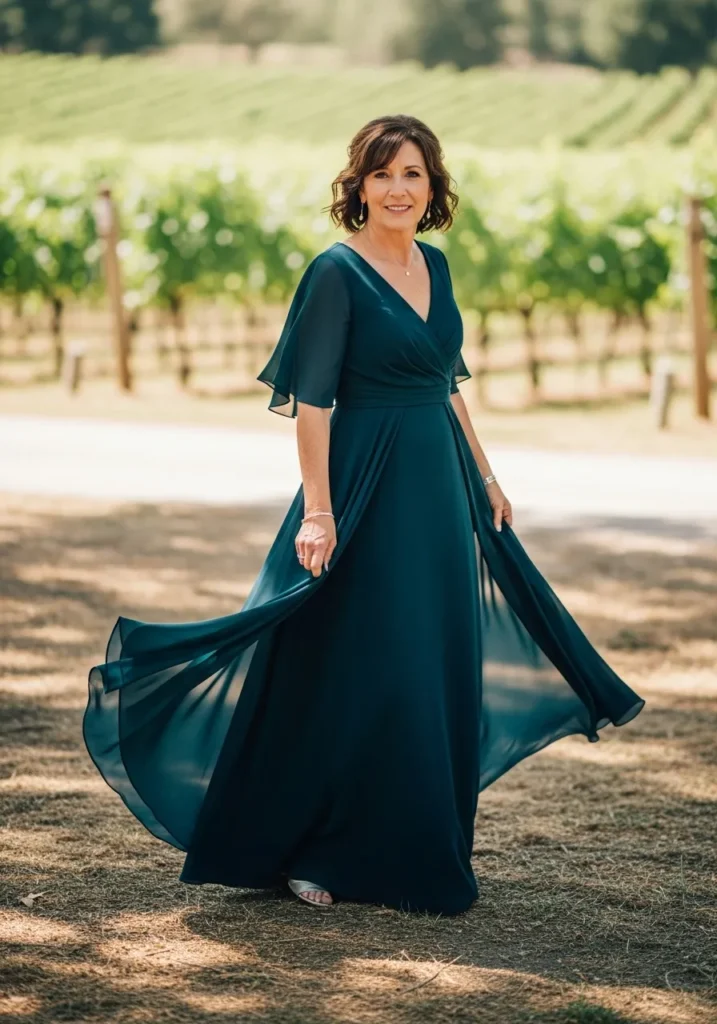 This teal chiffon gown showcases a soft v neckline, flutter sleeves, and a flowing skirt that creates beautiful movement. The lightweight fabric and relaxed structure make it perfect for outdoor fall celebrations.