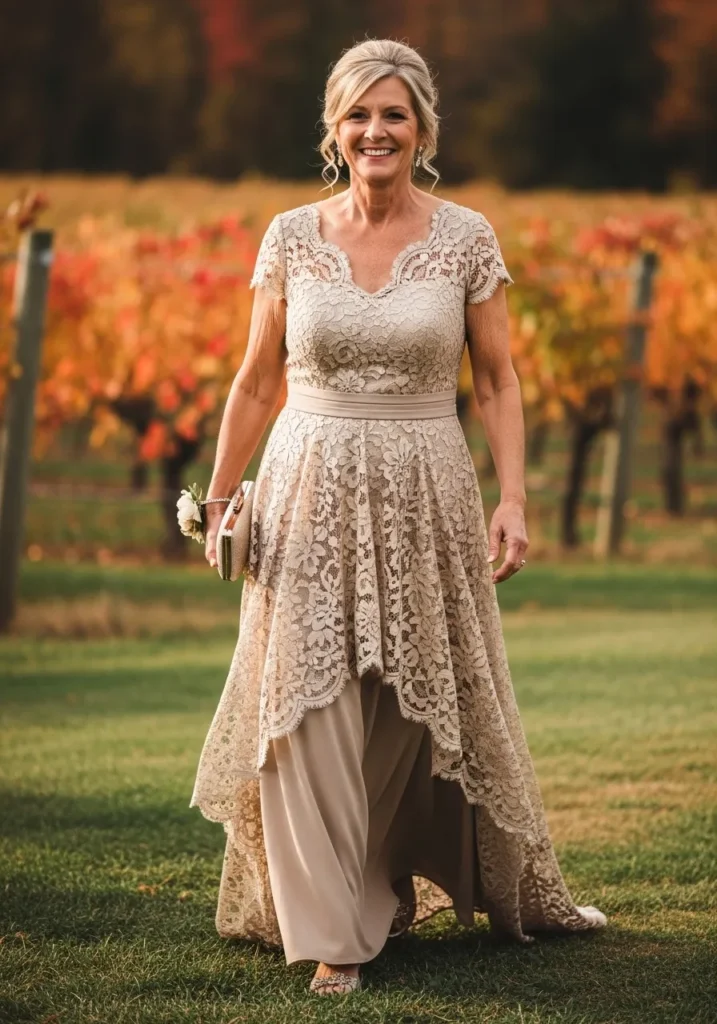This champagne lace gown features delicate floral embroidery, a softly fitted bodice, and a flowing layered skirt that feels romantic and graceful. The warm neutral tone pairs beautifully with vineyard scenery and fall foliage.