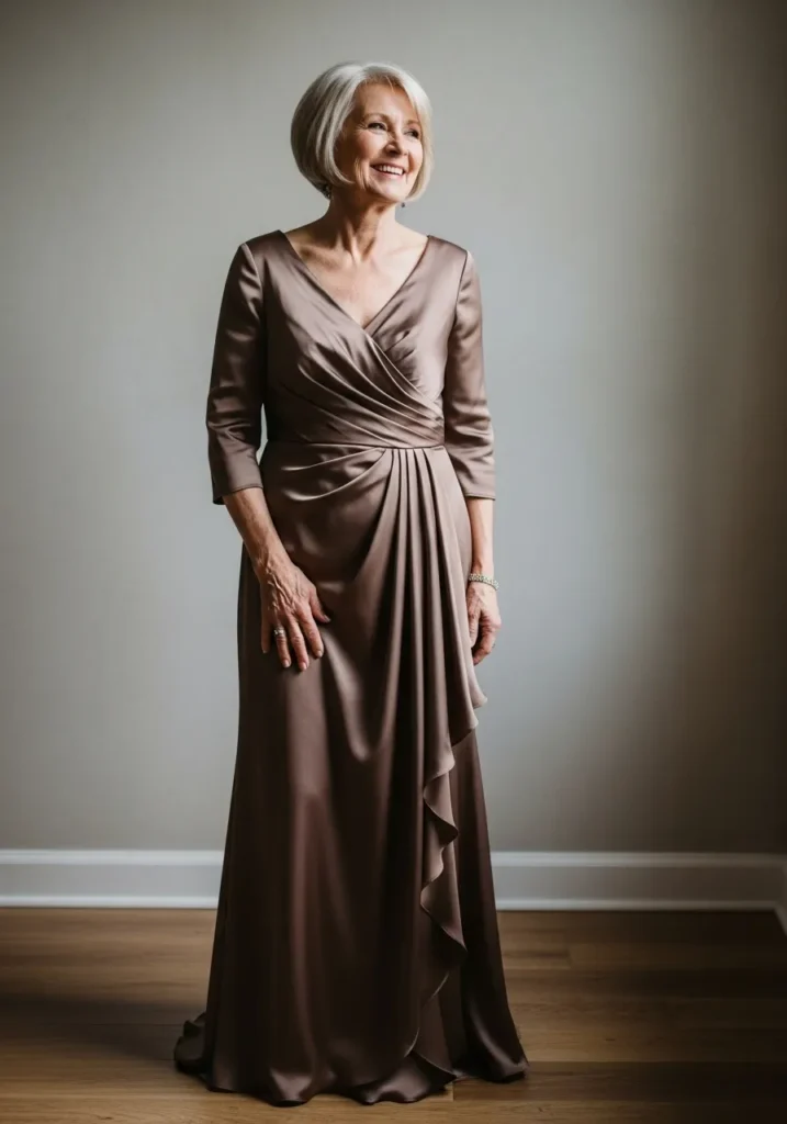 This mocha satin wrap gown features a softly draped bodice, three quarter sleeves, and a flowing skirt that flatters from every angle. The rich neutral shade and smooth fabric create a refined and luxurious appearance.