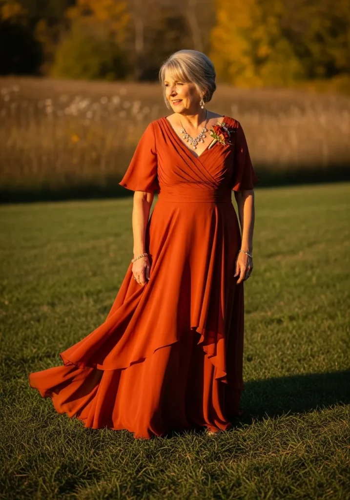 This gown stands out with its bold burnt orange shade, soft chiffon layers, and gently draped neckline that creates movement and flow. The airy skirt floats as she walks, while the rich fall tone brings warmth and seasonal charm to the entire look.
