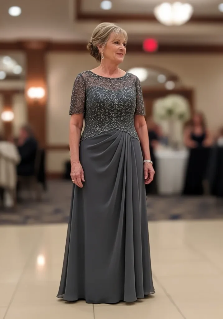 This charcoal gray gown showcases a softly structured bodice with delicate beading, short sleeves, and a flowing floor-length skirt. The subtle sparkle adds interest without overpowering the elegant silhouette.