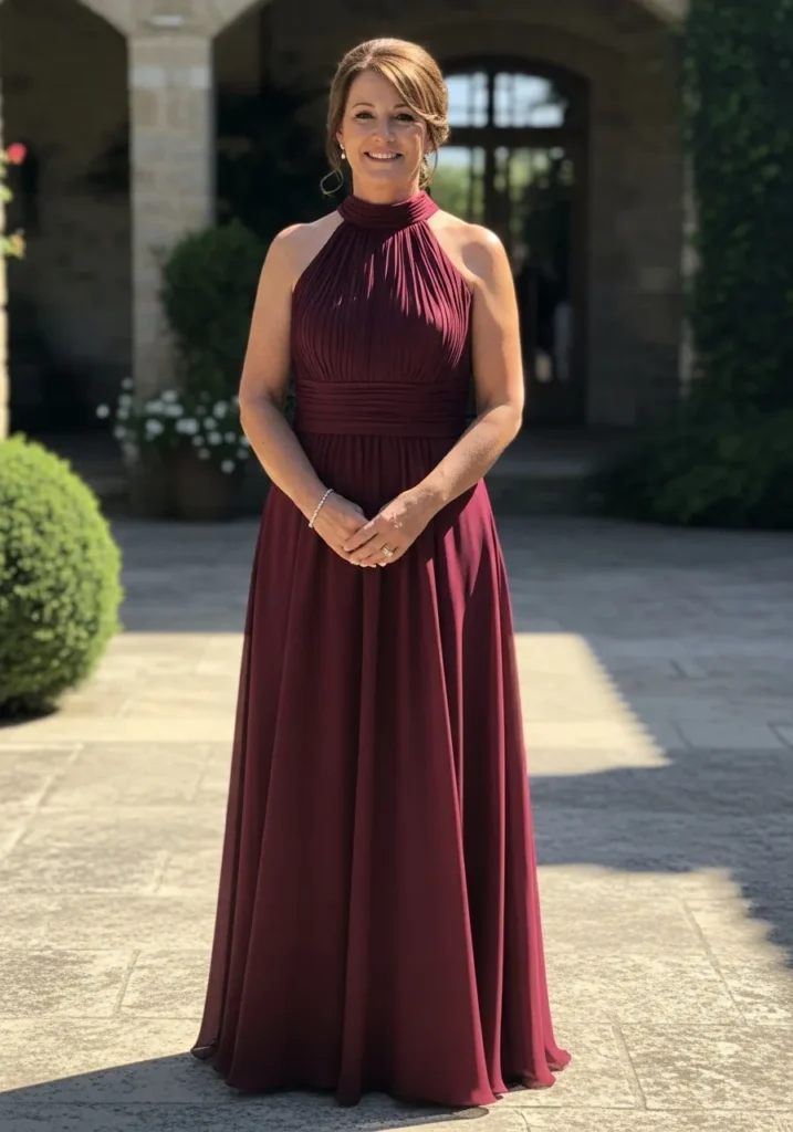 This look features a rich burgundy halter-neck gown with a softly gathered bodice and a full flowing skirt that moves beautifully with every step. The clean neckline highlights the shoulders, while the smooth fabric drapes naturally for a refined and graceful finish that feels timeless and polished.