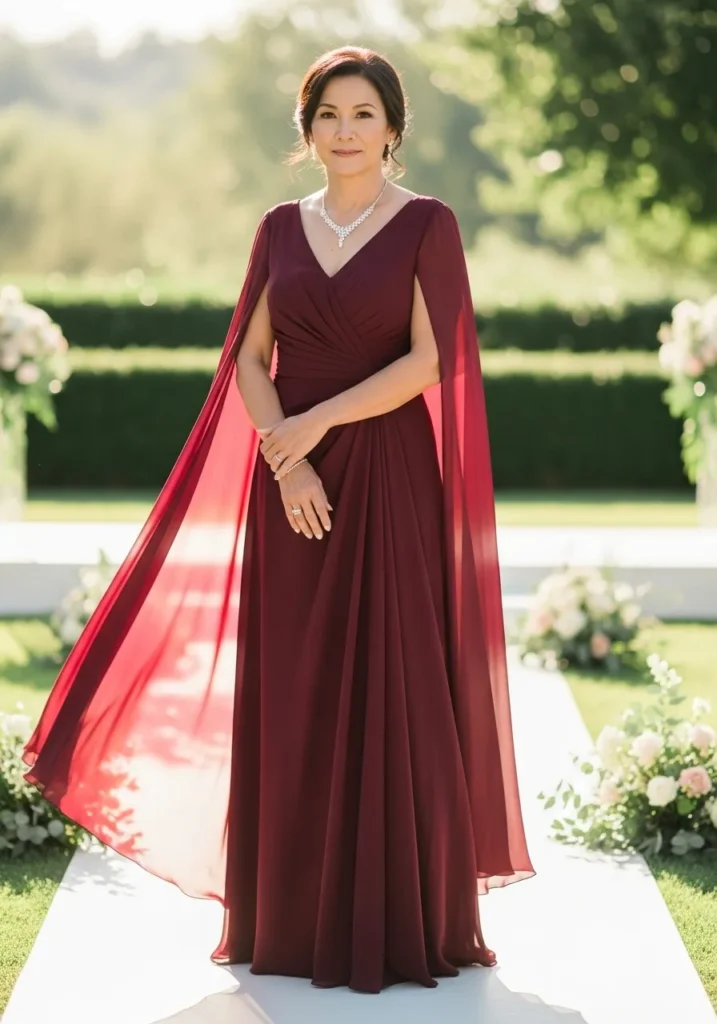 Dramatic Cape Sleeve Wine Gown with Regal Presence