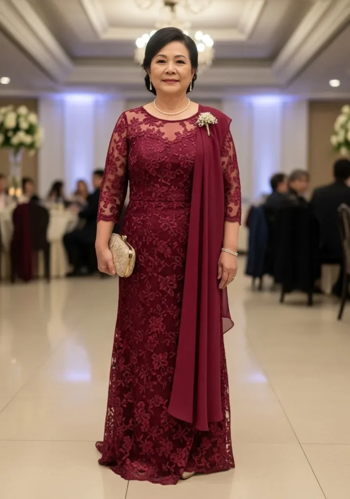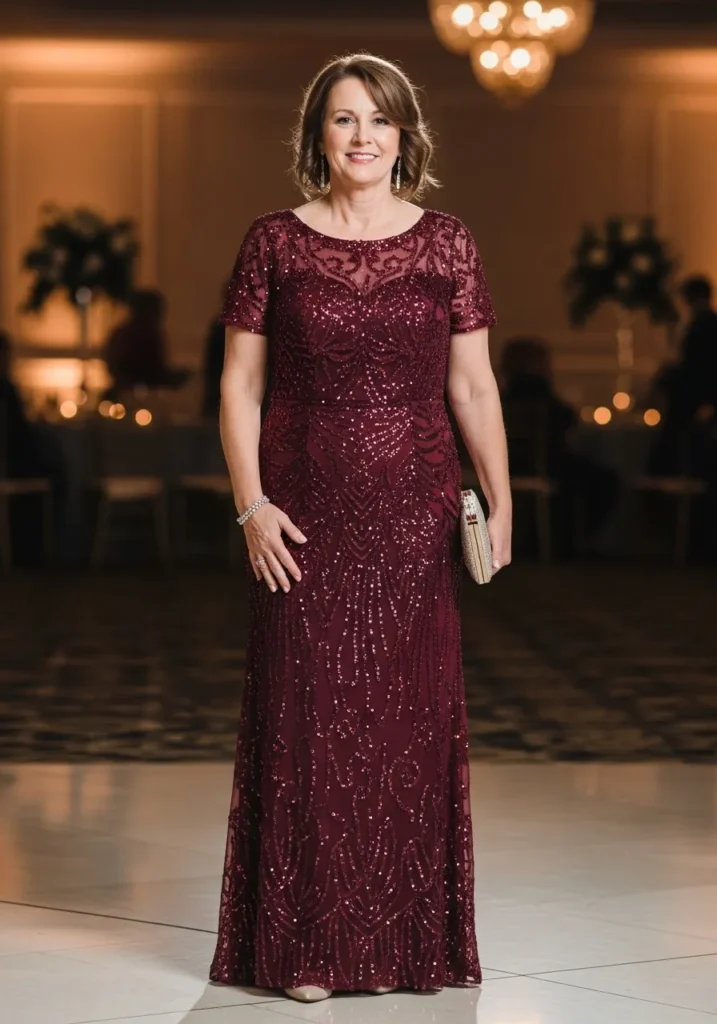 This deep wine gown is covered in shimmering lace and subtle sequins, creating a rich texture that catches the light beautifully. The fitted silhouette and elegant neckline give it a formal and luxurious presence that feels perfect for an evening celebration.