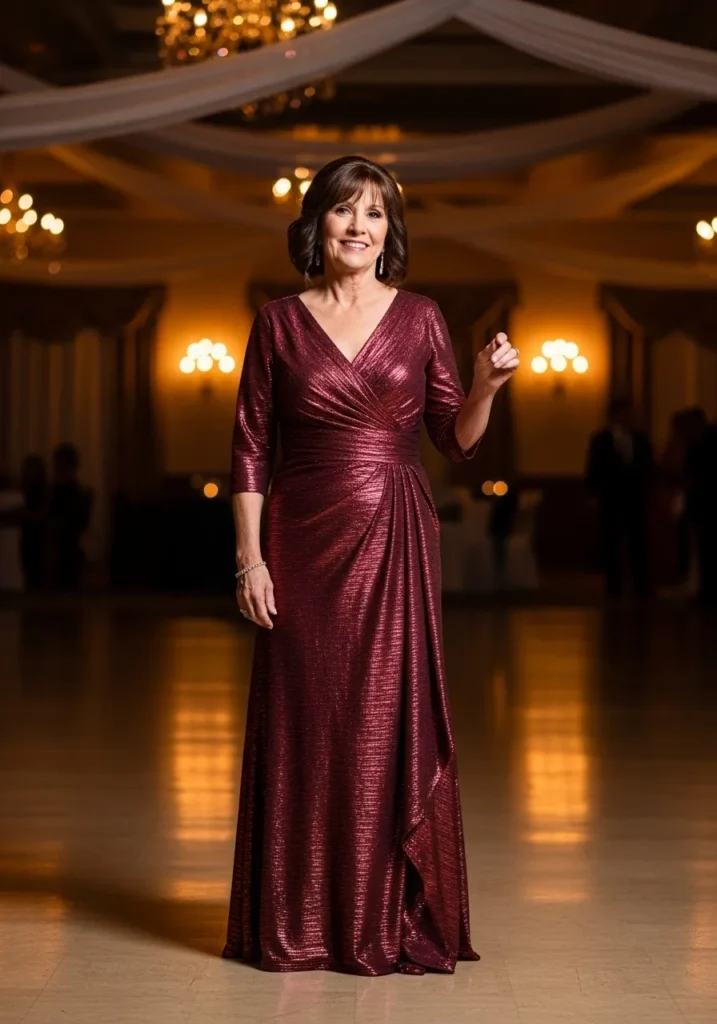 This stunning wrap-style gown in deep wine features shimmering fabric, a flattering V neckline, and soft pleating that drapes beautifully across the bodice. The subtle sparkle adds depth and movement, making the entire look feel glamorous yet refined.