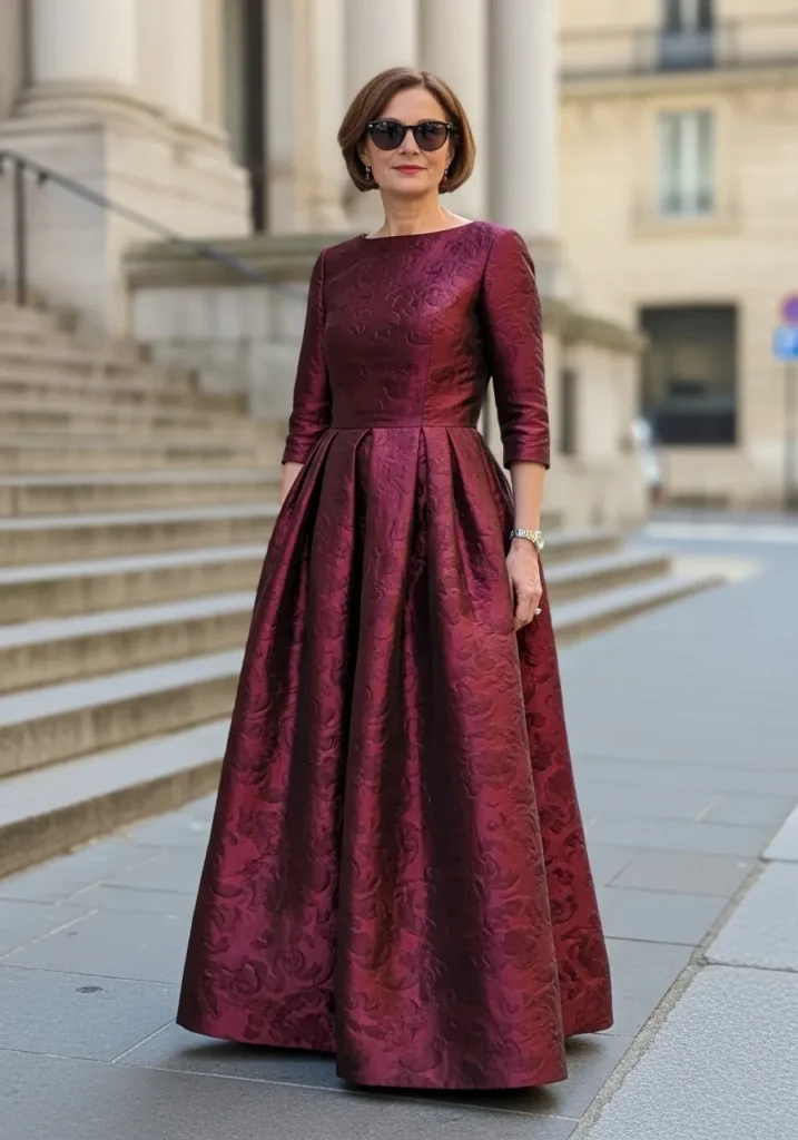 Textured Jacquard Wine Gown with Structured Silhouette