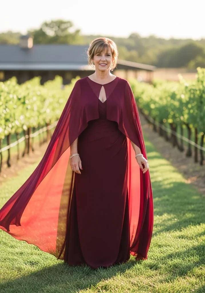 Dramatic Cape Overlay Gown in Rich Wine