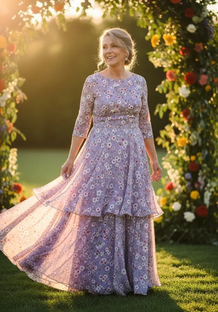 This gown features layers of airy lavender chiffon scattered with delicate floral prints, creating a soft flowing silhouette that feels light and romantic. The sheer long sleeves and gently gathered skirt add graceful movement, while the fitted bodice keeps the look elegant and polished. The overall effect is dreamy and feminine, perfect for a spring garden celebration filled with blooms and sunlight.