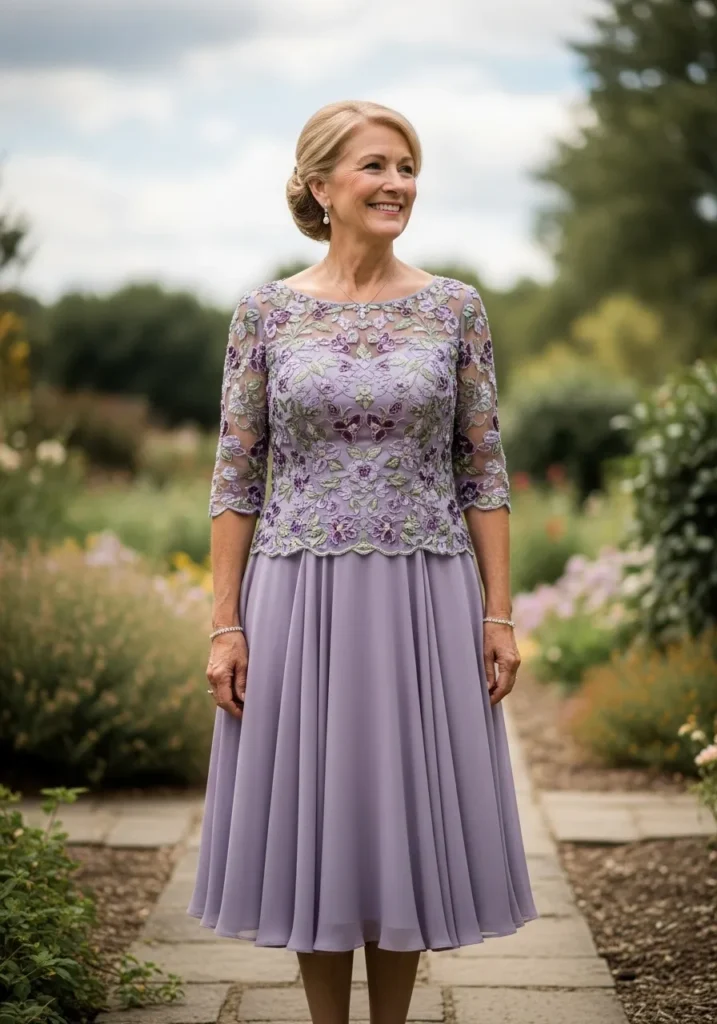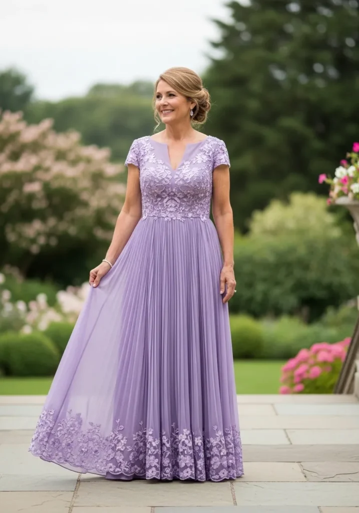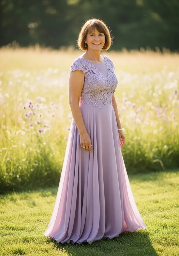 I adore how airy and romantic this look feels. The lavender shade is soft and flattering, and the flowy skirt makes every step look effortless. It feels polished yet relaxed, which is exactly what I love for a mother of the bride moment.