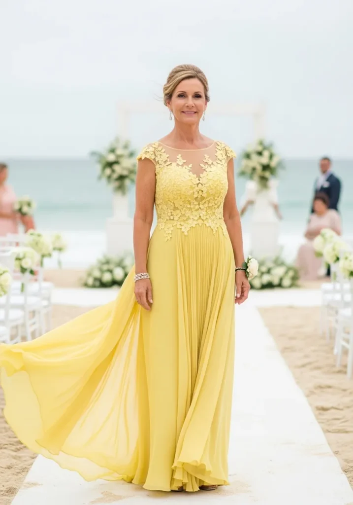 This radiant yellow gown features a flowing chiffon skirt and delicate floral bodice that feels light and joyful. The sleeveless cut and softly gathered waist create a flattering shape, while the airy fabric moves beautifully in coastal breezes. The bright hue brings instant warmth and energy to a seaside ceremony.