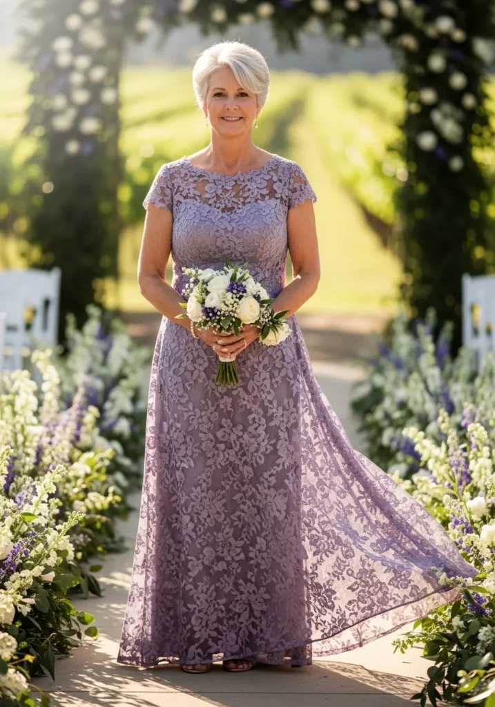 I’m such a fan of this gentle lavender shade. It feels soothing, romantic, and incredibly flattering. The lace details make the dress feel extra special while still staying soft and approachable, which is exactly the vibe I love for mother of the bride looks.