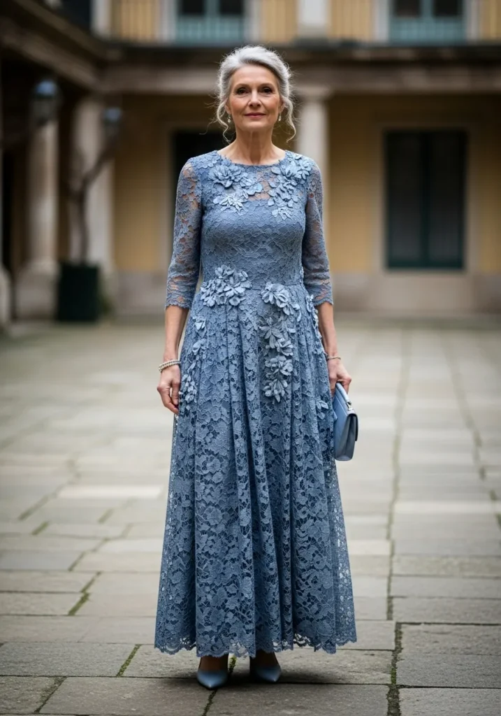 I’m completely charmed by how classic this dress feels. The lace pattern and muted blue shade create such an elegant presence, and it’s one of those looks that will never go out of style. It feels dignified, flattering, and wonderfully romantic all at once.
