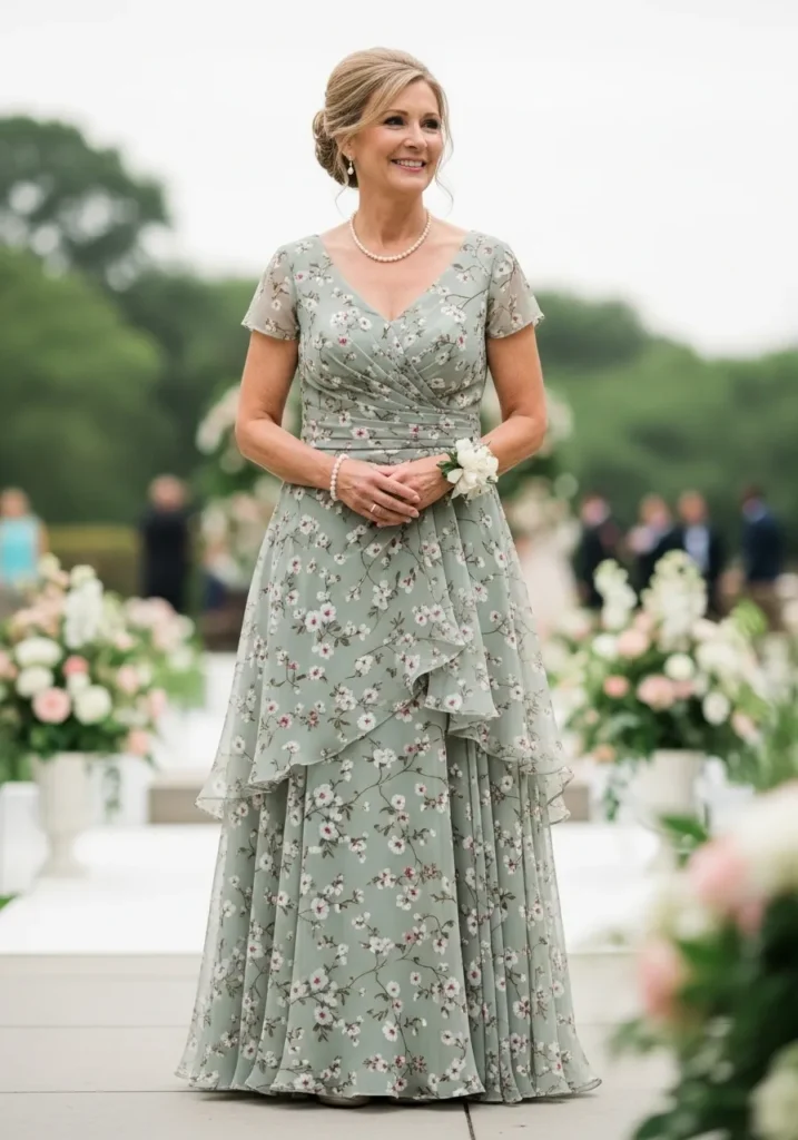 This soft sage gown features delicate floral prints layered across flowing chiffon tiers, creating gentle movement and an airy silhouette. The short sleeves and softly gathered waist keep the look flattering and comfortable, while the subtle pastel tone blends beautifully with garden ceremony settings and fresh spring florals.