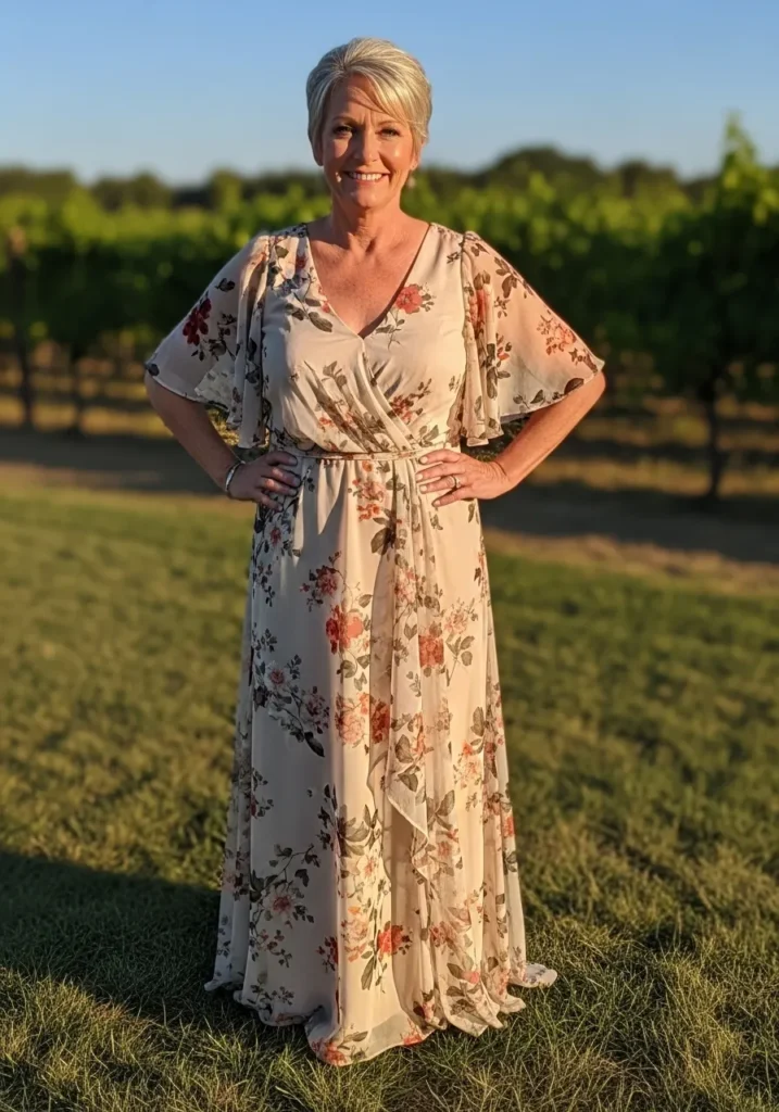 This dreamy floral maxi dress showcases soft pastel blooms scattered across airy chiffon, creating a romantic and relaxed silhouette. The loose flutter sleeves and gently cinched waist give the gown beautiful movement, while the flowing skirt glides gracefully with every step. Set against vineyard rows, the look feels perfectly suited for outdoor spring celebrations.