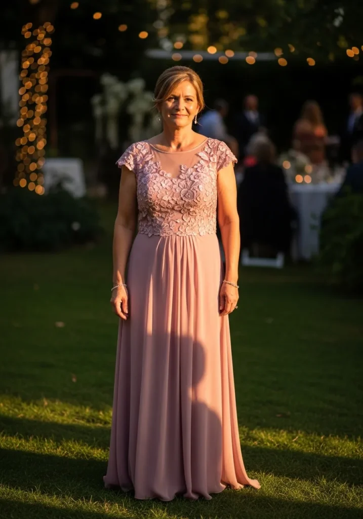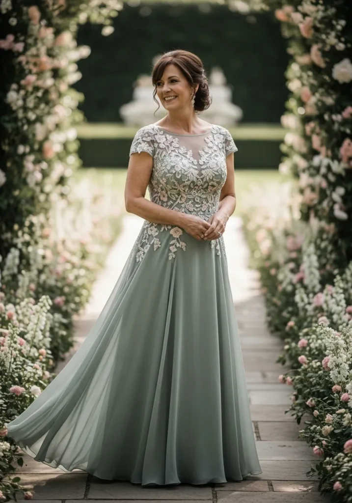 I absolutely love how serene and refined this dress feels. The lace detailing is intricate without being overwhelming, and the airy skirt gives it such a dreamy, effortless flow. It feels timeless, elegant, and perfectly suited for a spring garden wedding, especially for a mother of the bride who wants to look polished, graceful, and completely at ease on such a meaningful day.