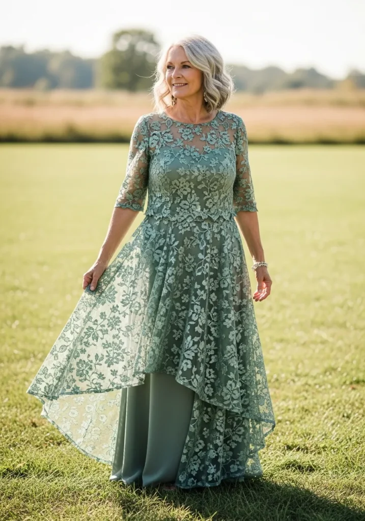 This stunning sage green gown features intricate floral lace layered beneath a soft asymmetrical chiffon overlay that moves beautifully with every step. The three quarter lace sleeves and gently flared skirt create a flattering silhouette, while the subtle high low hemline adds modern charm. The earthy tone blends seamlessly with outdoor garden or vineyard settings.
