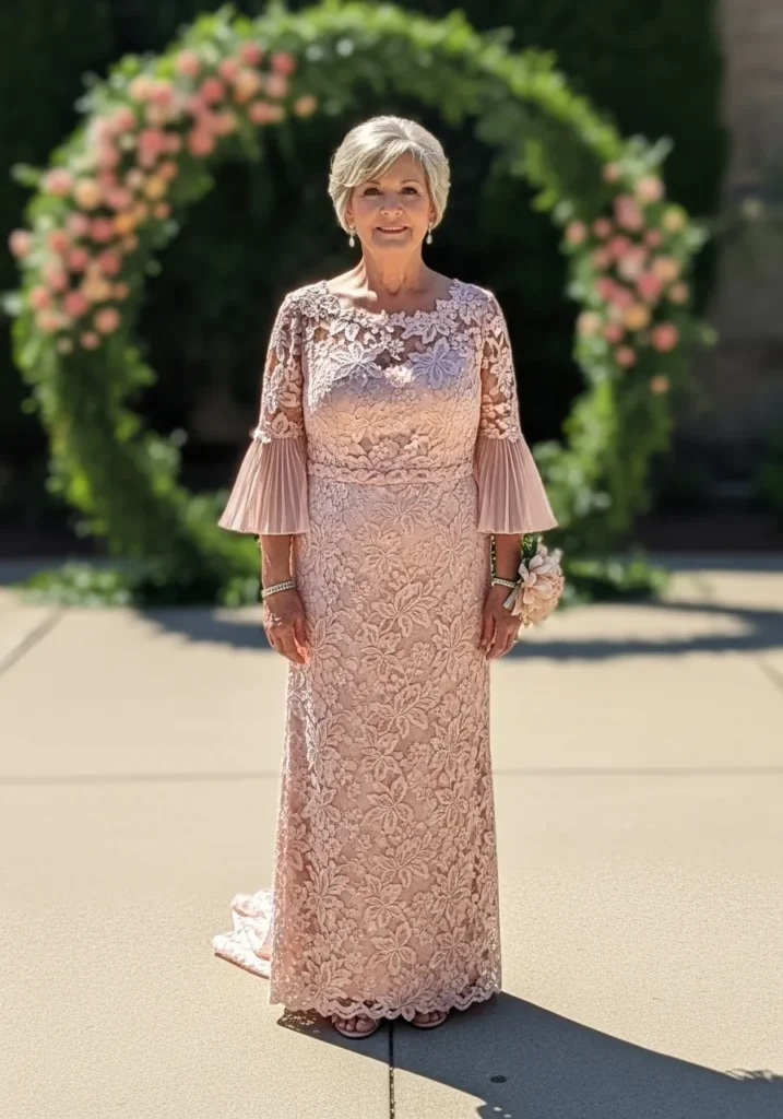 I adore how balanced this dress feels. The lace adds just enough texture and interest, while the flowing skirt keeps it comfortable and flattering. It feels refined but relaxed, which makes it such a lovely option for mothers who want to look polished without feeling overly formal.