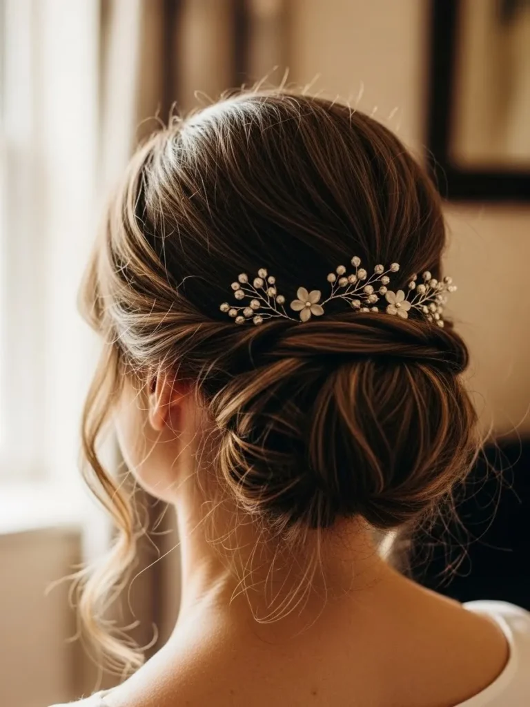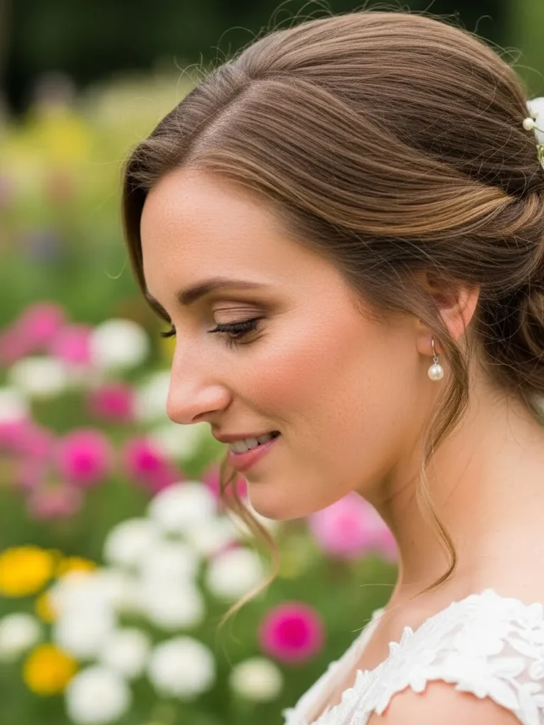 The bride’s hair is styled into a soft low bun with gentle volume at the crown and loose face framing pieces. A delicate floral hairpin adds just enough sparkle without overpowering the look. The finish feels natural and airy which fits beautifully with an outdoor garden setting.