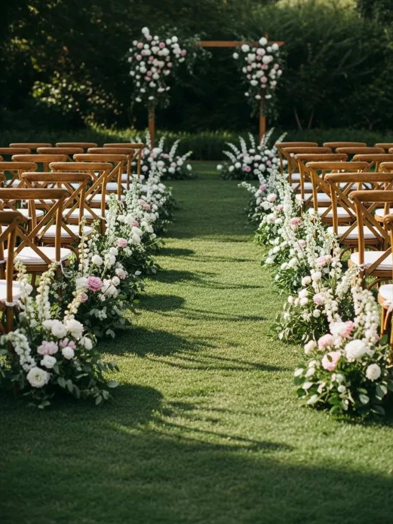 A lush green aisle is lined with abundant floral arrangements leading toward a simple floral arch. Wooden chairs add warmth while the flowers bring softness and romance. The layout feels symmetrical yet organic.