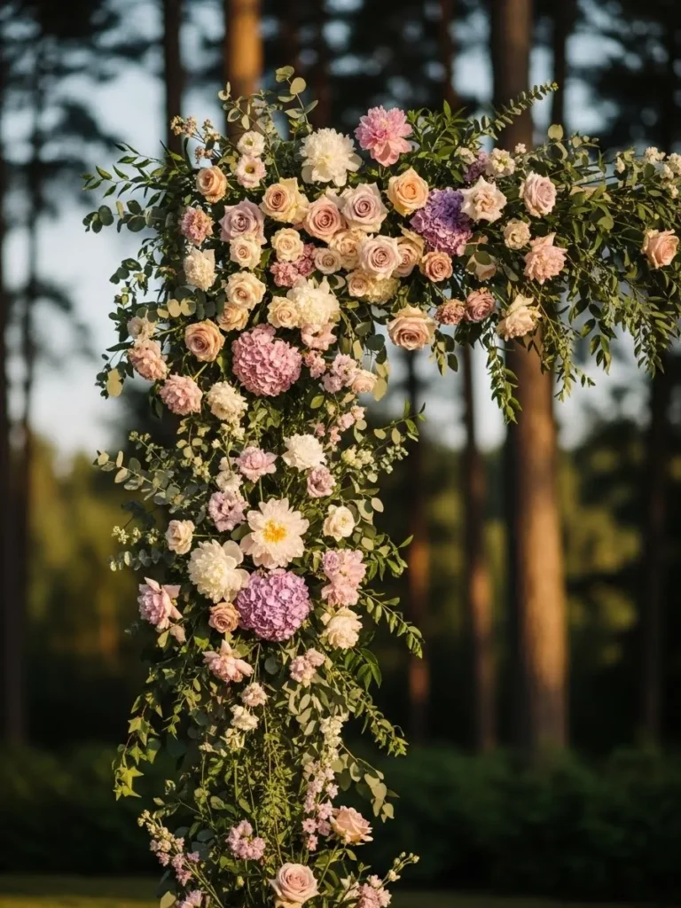 A large floral arch overflows with pastel blooms and greenery, blending seamlessly with the surrounding trees. The flowers cascade naturally creating depth and texture. It feels whimsical and slightly wild in the best way.