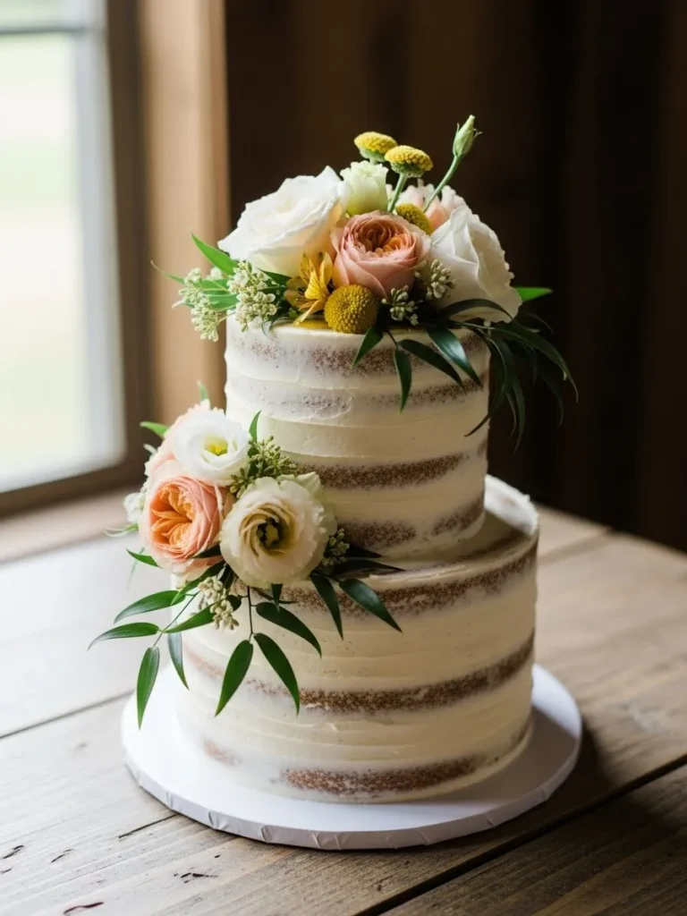 A semi naked wedding cake is decorated with soft blush and cream roses along with fresh greenery. The textured frosting keeps the look natural while the flowers add a romantic garden touch. Placed on a simple wooden surface, the cake feels charming and effortless.