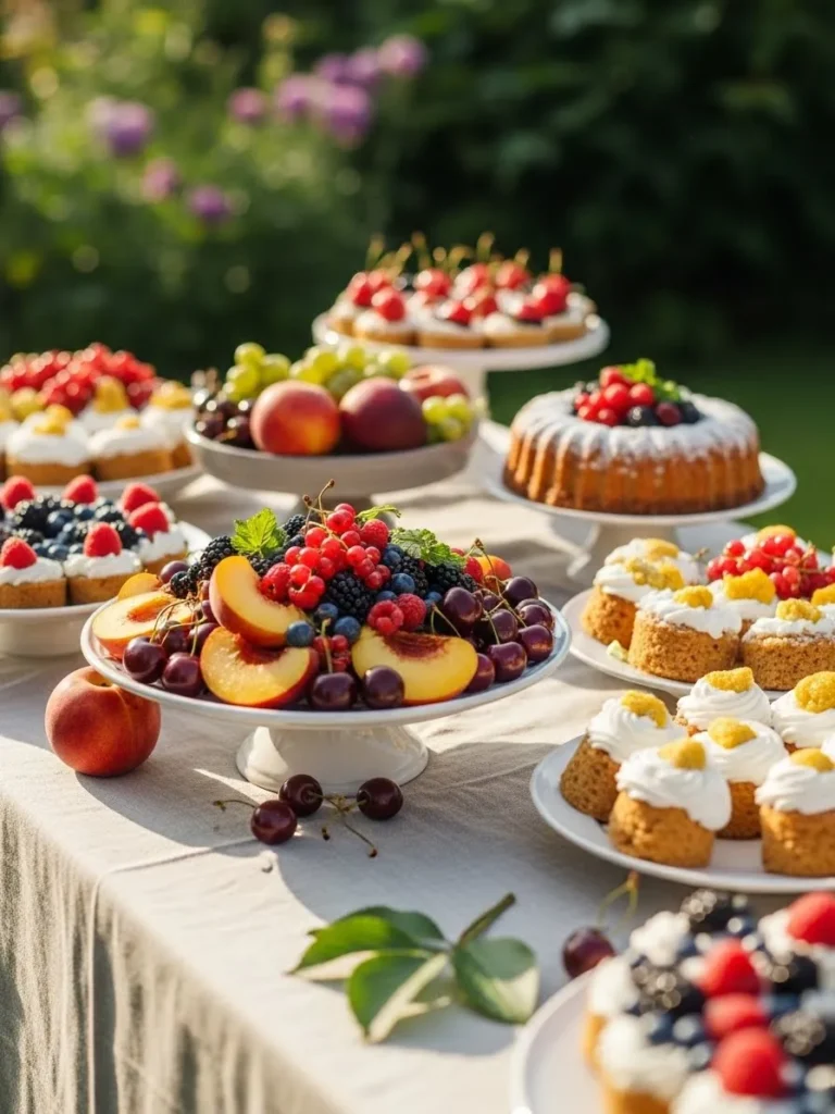 A dessert table is filled with fruit tarts, berry topped cakes, and elegant pastries arranged on white stands. Fresh fruit adds bright pops of color against the soft linens. The setup feels abundant and inviting without feeling overdone.